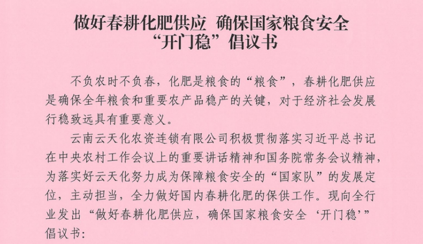 云天化發(fā)布“春耕保供開門穩(wěn)”倡議廣大合作伙伴積極響應1月31日,云南云天化農(nóng)資連鎖有限公司發(fā)出《做好春耕化肥供應確保國家糧食安全“開門穩(wěn)”倡議書》?;时9┦玛P糧食安全和農(nóng)民生計,春耕生產(chǎn)的關鍵時期,確保農(nóng)業(yè)穩(wěn)產(chǎn)增產(chǎn)、提高農(nóng)業(yè)綜合生產(chǎn)能力,...